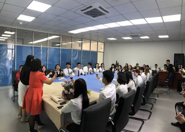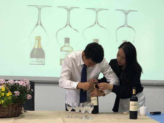 课堂生动地向学生们讲解了红酒礼仪的相关知识,并以演化式教学方式为主导,学生们在企业指导教师的一一示范下边学习边操作,气氛热烈。