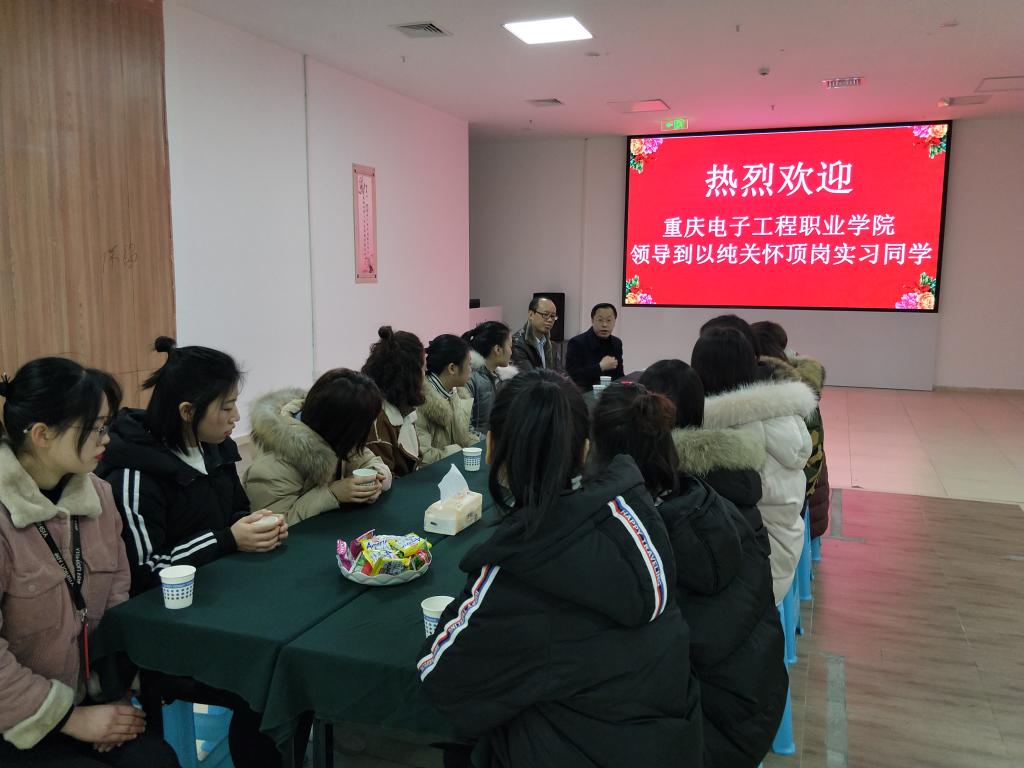 1月15日上午,重庆电子工程职业学院mksports恩波利党总支书记谢鑫、院长黄志平、党总支副书记廖坤科、副院长汪启航一行来到南岸区以纯集团有限公司重庆分公司看望慰问学院以纯订单班顶岗实习全体学生。