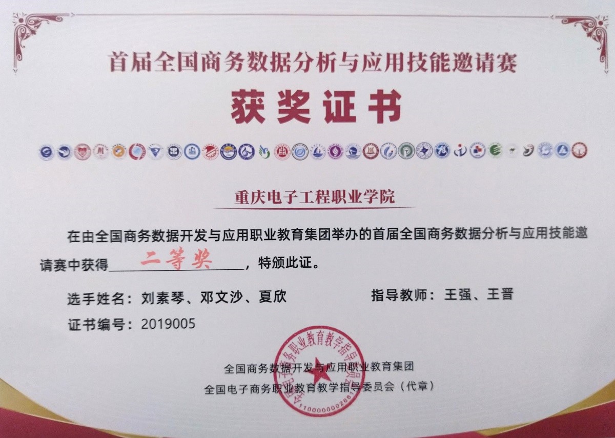 首届全国商务数据分析与应用技能邀请赛于2019年12月7日在浙江金华职业技术学院举行,由mksports恩波利数字贸易专业群王强、王晋两位老师指导,电商18级刘素琴、邓文沙、夏欣三位学生组成的团队表现优异,从来自全国近二十个省市不同职业院校组成的31支参赛队中脱颖而出,以总成绩排名第四,二等奖排名第一的成绩,获得二等奖。