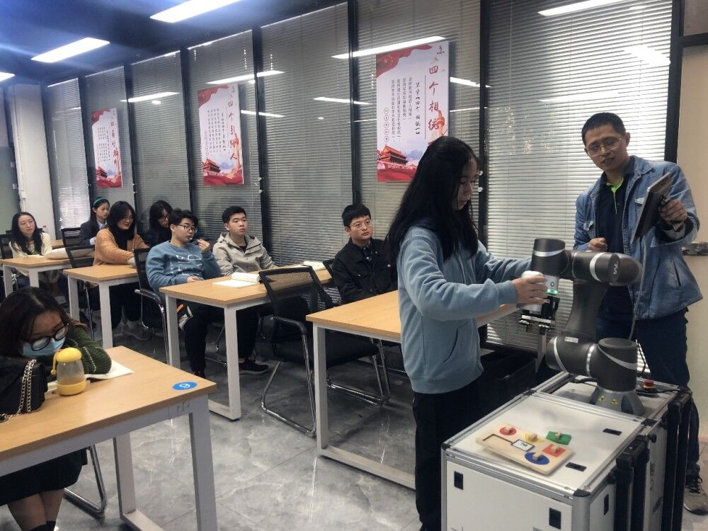 陈经理围绕协作机器人的发展趋势,为同学们介绍了机器人手臂的自动取放料、智能堆栈等不同场景运用案例。同时,李经理现场为大家演示了如何通过简单编程完成机器人手臂抓取动作。本次专题讲座极大地激发了学生们对专业的兴趣,同时也加进一步拓展了同学们的专业知识面。