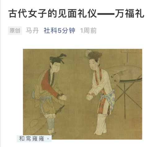 近日,mksports恩波利“六艺”素质赋能课程组在由重庆市社科联制作出品的微信公众号“社科五分钟”开展了“古代女子的见面礼仪-万福礼”的线上科普,吸引了300多人次网友阅读关注,收获“在看”和“赞”共计90余次,产生了较好的科普传播效果。