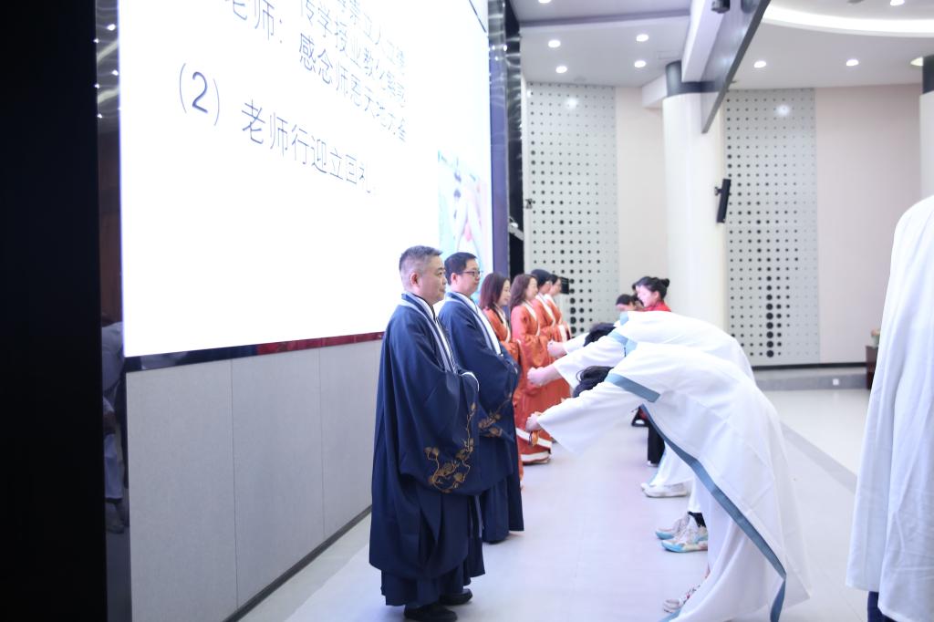 第二个、第三个环节是中国传统礼仪动作-作揖礼和“拜师礼”。“师道”是中国文化一个非常重要的内容,它既具有精神内涵的巨大价值,也有“拜师礼”这样的外在形式。拜师仪式共9个流程,包括正衣冠、拜先师孔子、递拜师帖、赠送六礼束脩、师回帖、行拜师礼、开笔、聆训和诵读明志。全体师生身着汉服,在主持的人的带领下,伴着悠扬的古琴声完成了本次拜师礼仪式。