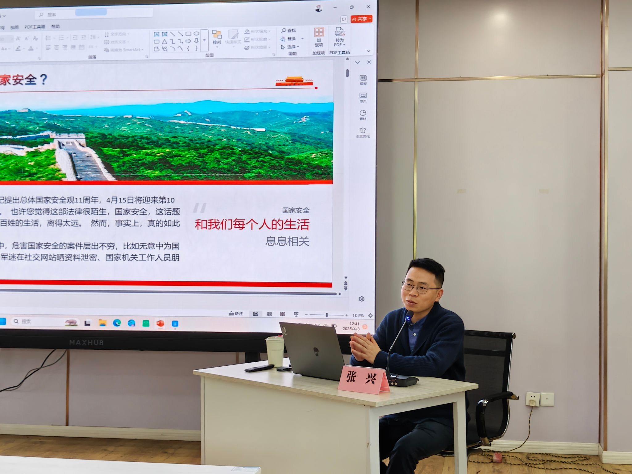 张兴老师以“总体国家安全观 创新引领10周年”为主题,围绕大学生国家安全观教育展开专题讲座。他从五个方面深入讲解:一是何为国家安全,二是当前国际国内形势,三是危害国家安全的行为及相关罪名,四是如何维护国家安全,五是谁来保卫国家安全。张兴老师强调,作为“青马工程”学员,要积极传播国家安全知识,带动身边同学共同维护国家安全。