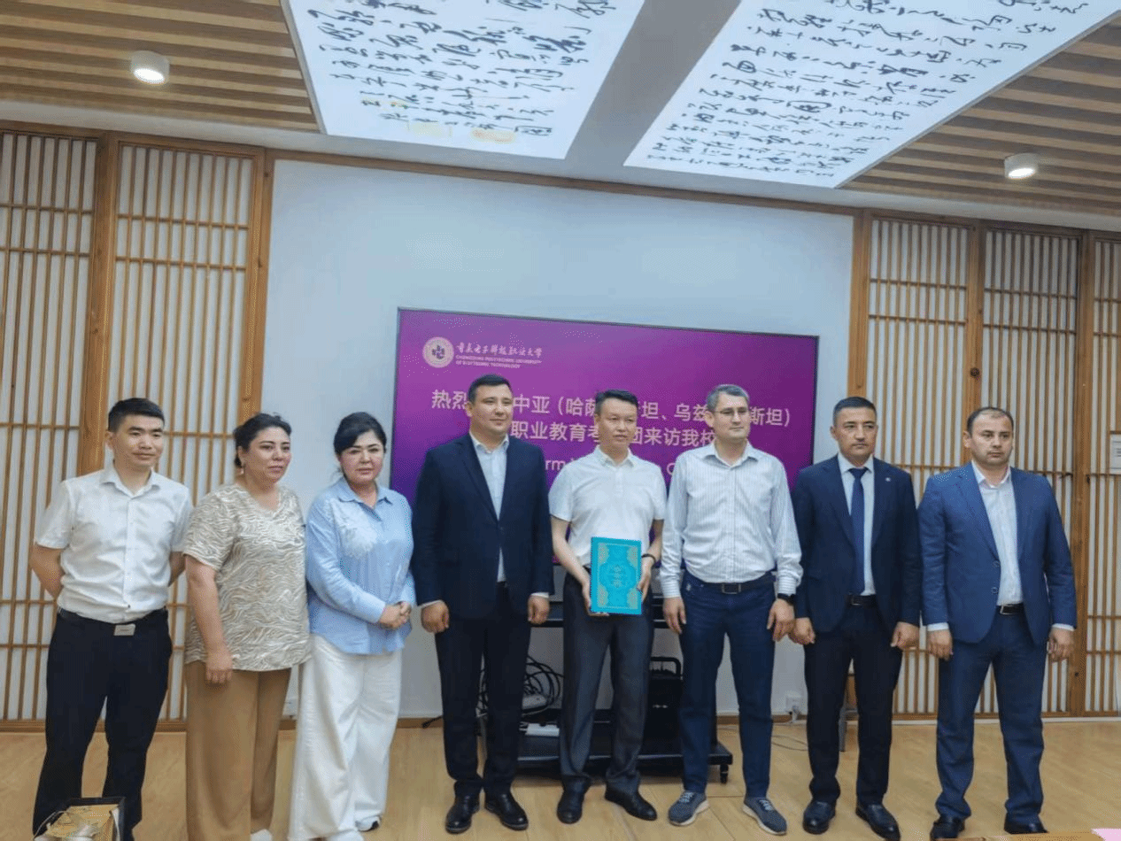 考察团一行首先参观了学校校史馆,通过图文、实物及多媒体展示,全面了解学校发展历程、办学特色及在产教融合、技术创新领域的成就。在我院六艺素质赋能馆,考察团围绕职业教育国际化、专业共建、师资培训等议题与我校代表展开座谈。哈萨克斯坦教育部直属机构 “Talap” 总裁 Tatibekov Sanzhar,乌兹别克斯坦高等教育、科学和创新部首席专家 Ergashev Elyor 对学校取得的成绩高度评价,表示希望以此考察交流为契机,与我校在专业建设、师资建设、人才培养等领域开展深度合作,助力中哈、中乌职业教育长足发展。