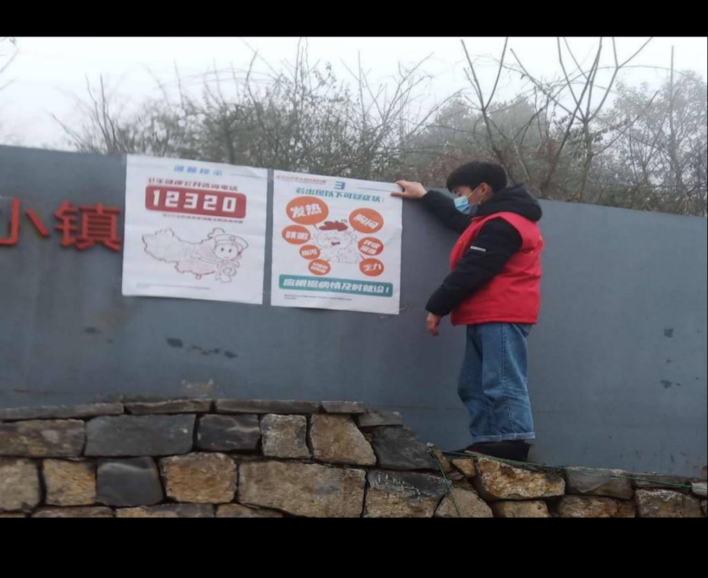 (图为冉义杰在镇上张贴疫情防控宣传海报)