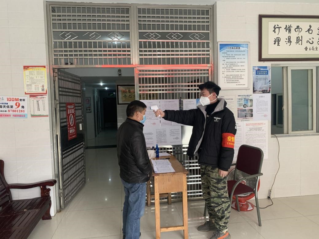 (图为徐泽沛为社区居民测体温)