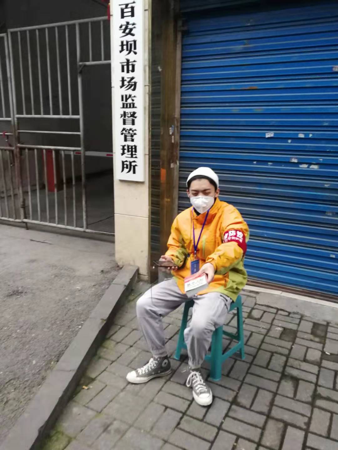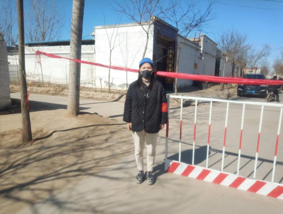 (图为文子萌在社区出口执勤)