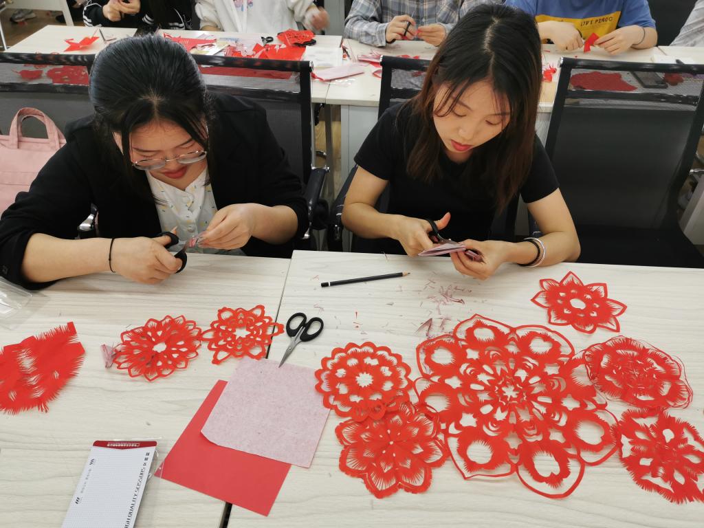 在本次培训中杨艺老师通过“剪纸照片”把同学们带入浓厚的剪纸氛围中,讲解了中国吉祥代表物之一“喜鹊”、剪纸的方法和剪纸历史,并展示了精美的剪纸作品。杨老师先示范后指导,手把手与同学们一起剪纸。整个过程生动有趣,国家非物质文化遗产磅礴的创造力、民族性深深融入了同学们的心中。