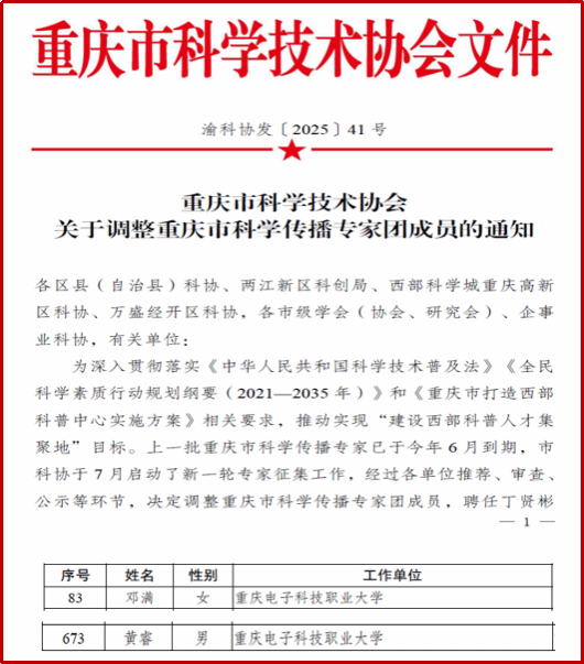 为深入贯彻落实《中华人民共和国科学技术普及法》《全民科学素质行动规划纲要(2021—2035年)》和《重庆市打造西部科普中心实施方案》等文件相关要求,推动实现“建设西部科普人才集聚地”目标,重庆市科学技术协会启动新一轮科学传播专家征集工作。经过各单位推荐、严格审查、社会公示等环节遴选,2025年9月12日,重庆市科学技术协会发布《关于调整重庆市科学传播专家团成员的通知》(渝科协发〔2025〕41号),公布新一轮重庆市科学传播专家名单。......