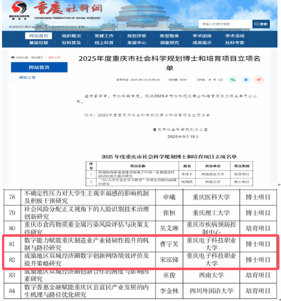 2025年9月18日,重庆市社会科学规划办公室公布“2025年度重庆市社会科学规划博士和培育项目立项名单”。学院教师曹宇芙博士主持的《数字能力赋能重庆制造业产业链韧性提升的机制与路径研究》、宋泓锑博士主持的《成渝地区双城经济圈数字创新网络绩效评价及提升策略研究》,获批立项年度博士项目。一直以来,学院始终高度重视科研工作,学院教师在科研项目、学术论文、成果转化等方面的科研成果已获得较大进展。此次立项既是对其个人扎实研究基础和创新学术思想的充分肯定,......