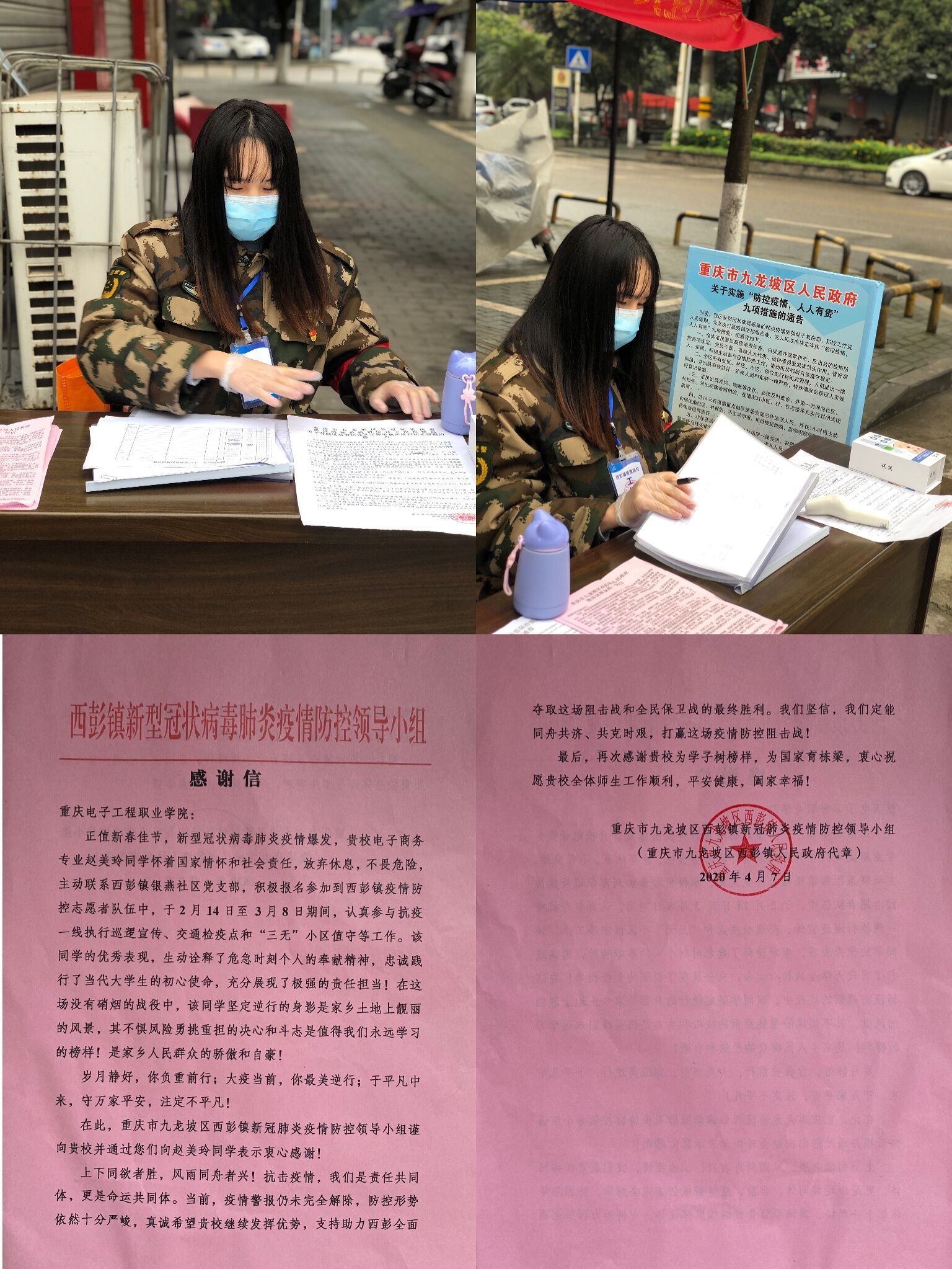 哪里有困难哪里就有中国共产党党员的身影!2020年2月14日至3月3日期间,重庆电子工程职业学院mksports恩波利电子商务1701班学生党员赵美玲,一直坚守在重庆市九龙坡区西彭镇银燕社区的疫情防控志愿服务岗位上。据悉,赵美玲负责当地老式住宅区进出口的人员及车辆登记、体温检测、上报返渝人员情况和社区人员信息录入、电话沟通询问居民健康状况以及分发口罩等工作。虽然志愿服务工作项目繁多,但是她却处理得有条不紊。在接受线上......
